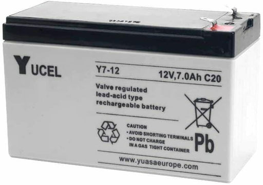 Yuasa Y7-12 - Valve Regulated Lead Acid Battery Yucel ITEM DESCRIPTION Voltage:12v Capacity:7Ah Weight 2.2Kg Dimensions: L 151mm x W 65mm x H 9...